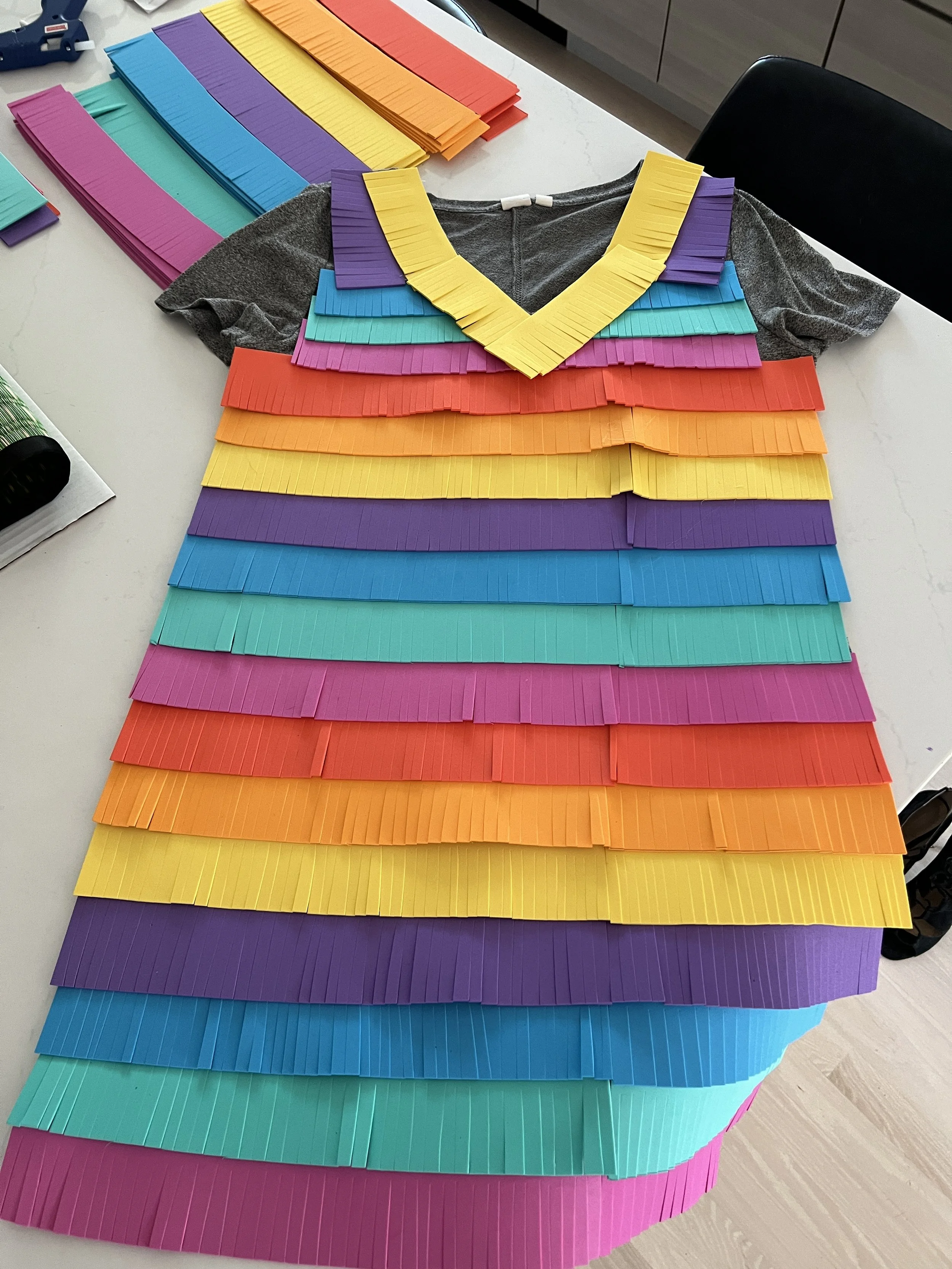 Then simply hot glue the strips onto the shirt dress, with each fringe slightly overlapping the last one so as to cover the shirt. Improvise around the neckline and sleeves with smaller pieces to get as much of the dress covered up as possible.