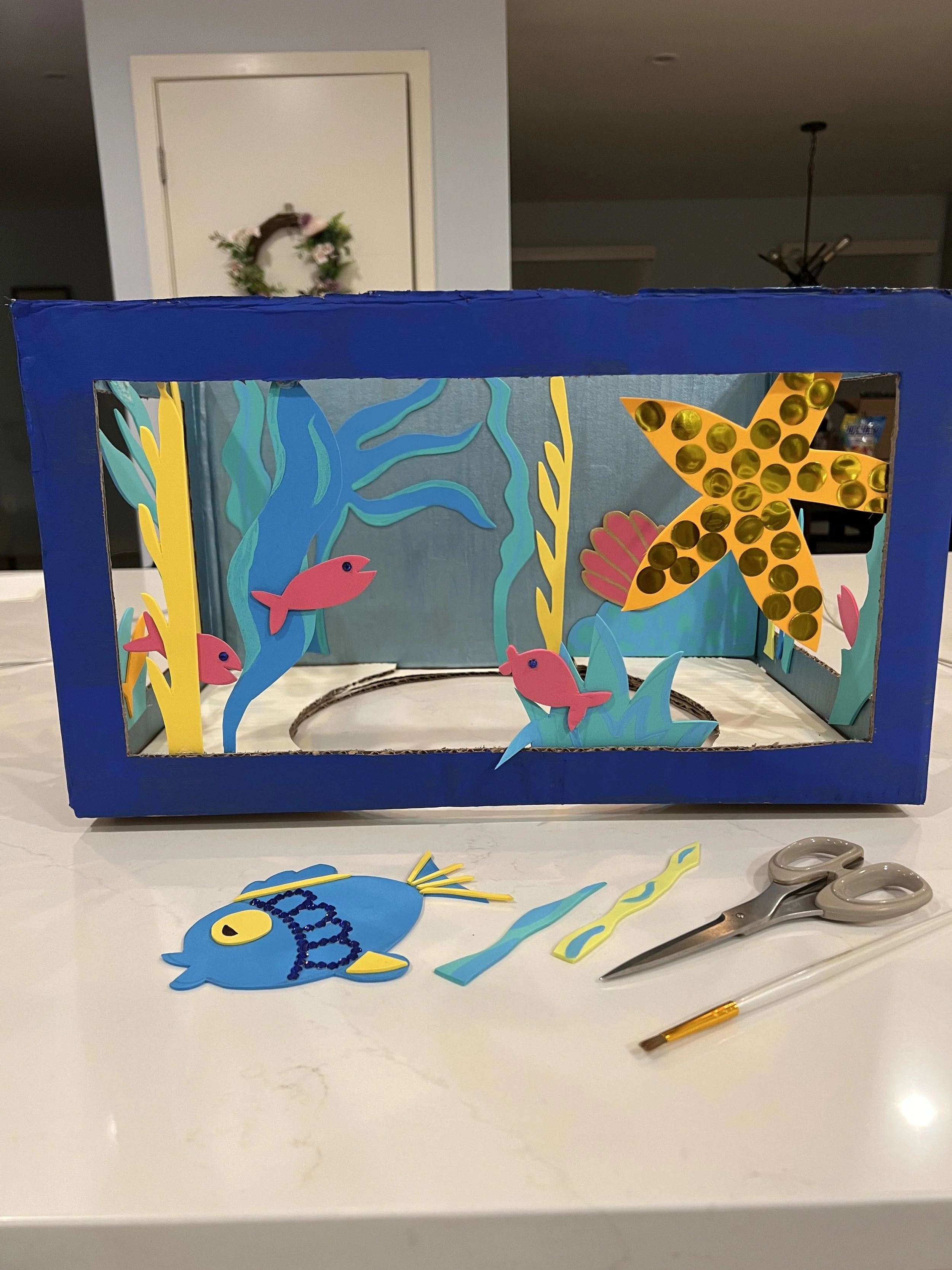 Paint and allow to dry. Make foam cutout of the seaweed and sea creatures that you attach with hot glue or tape as needed. This was honestly so much fun to make, I kept adding and adding and adding!