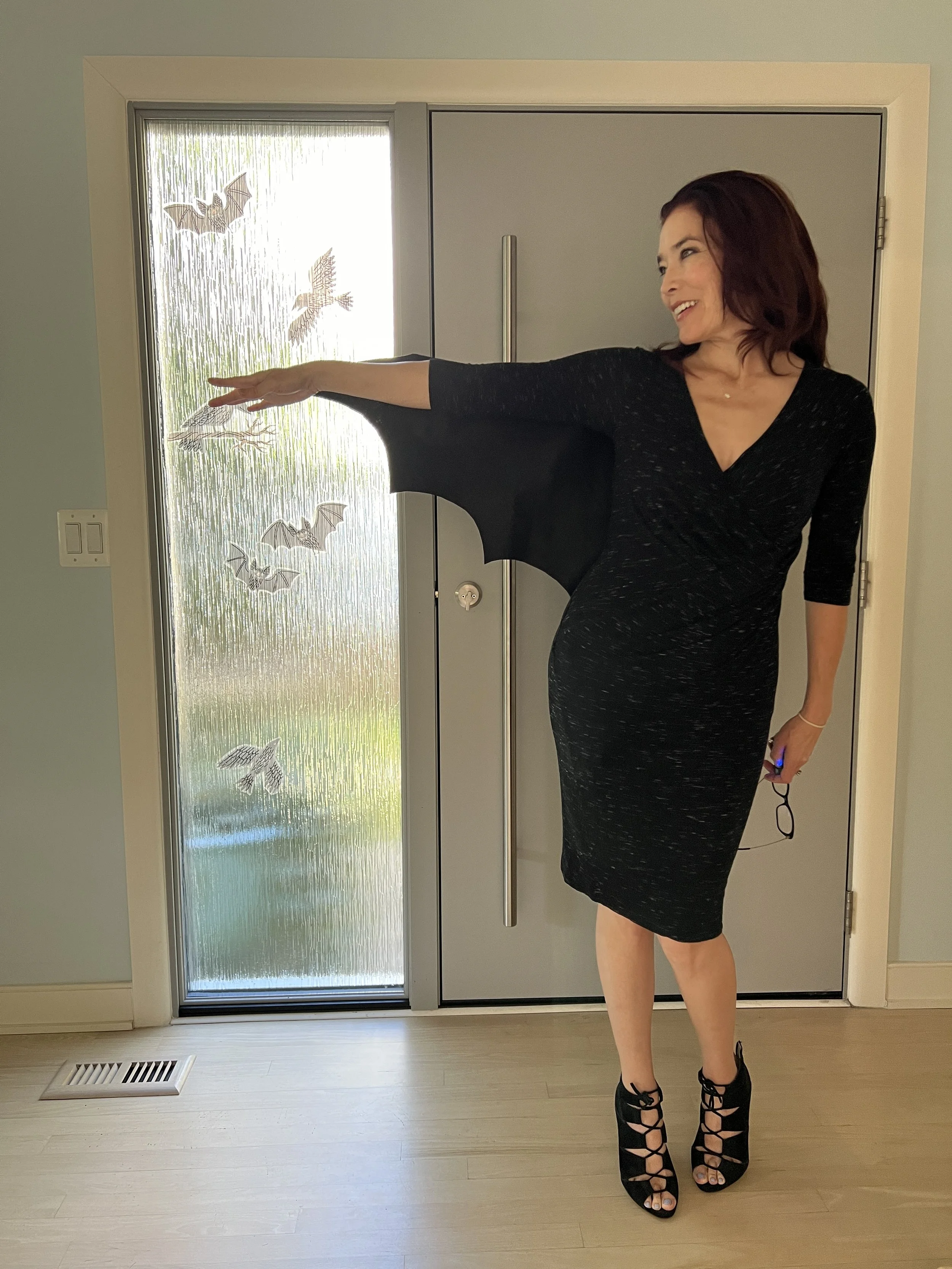 The Extra: hot glue hair ties near the wrist areas, to make sure your wing fully opens when you stretch out your arms! Do a red lip, pale makeup and some fake red blood dripping from the lips for the full Dracula bat effect!