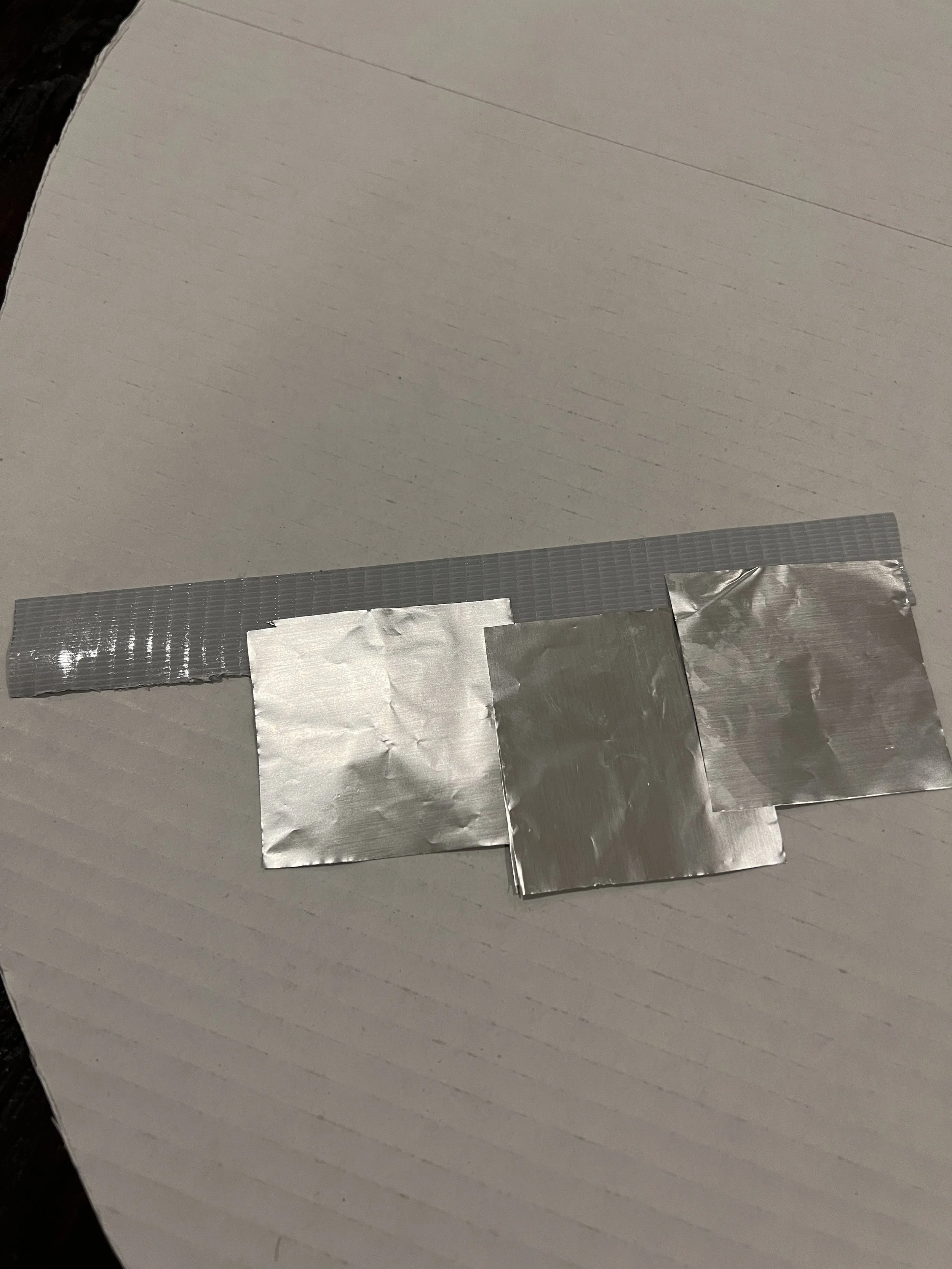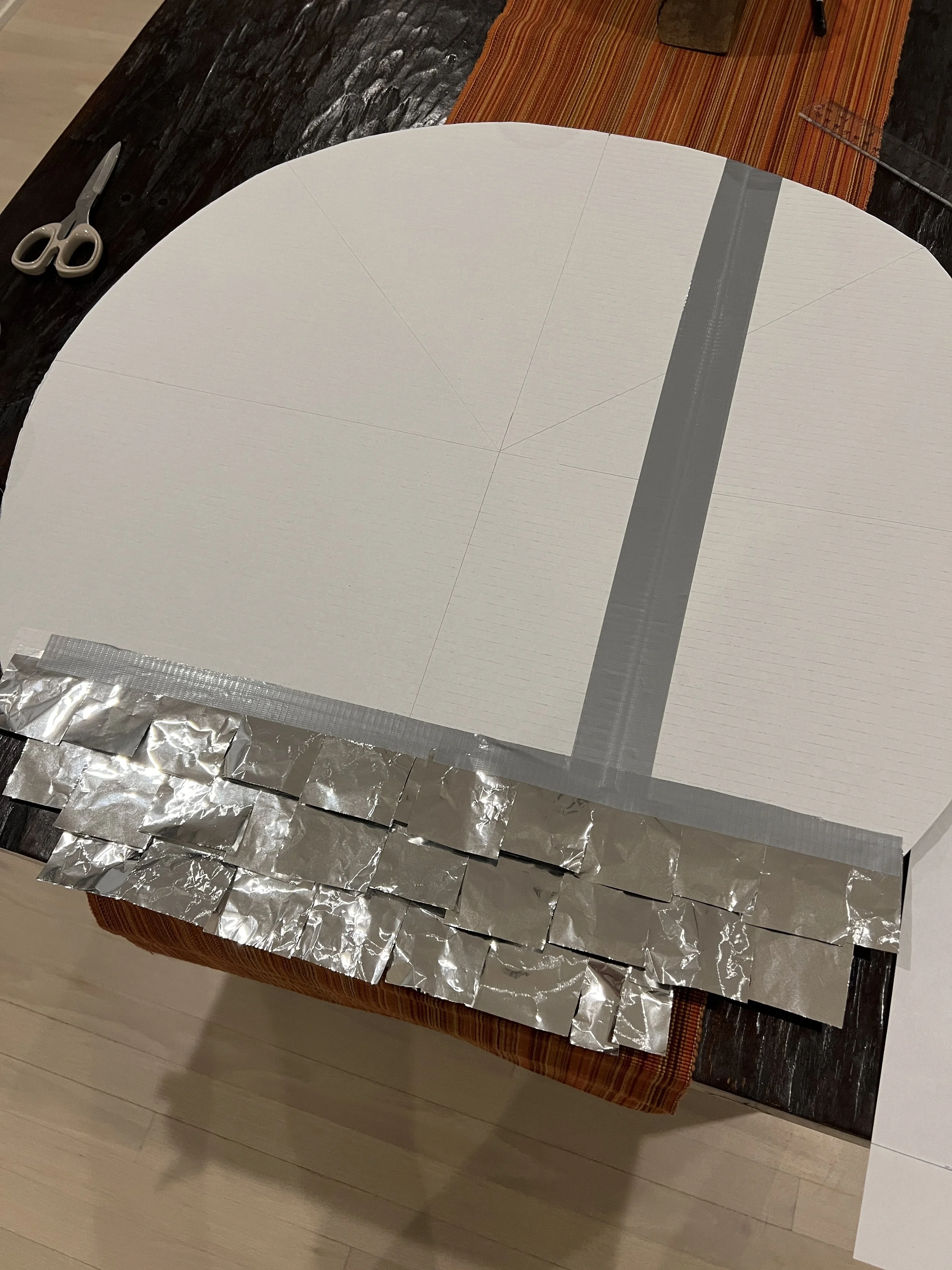Cut a strip of silver duct tape in half using sharp scissors. Line up the 2” aluminum foil squares at slightly varying heights, overlapping slightly in a row onto the duct tape.