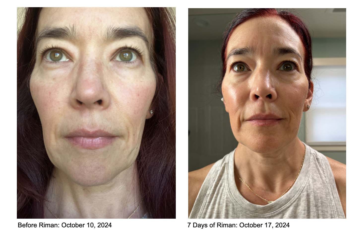I have been using Riman now since the fall of 2024, and saw a marked difference of hydration from the very start within just days of use. Over time, I have also seen a reduction of redness, freckles, Asian “age” spots and the like. My skin is glowy, bouncy and evenly balanced, and often is so glassy and shiny that I need to add powder to tame the glow before I hit a TV set!